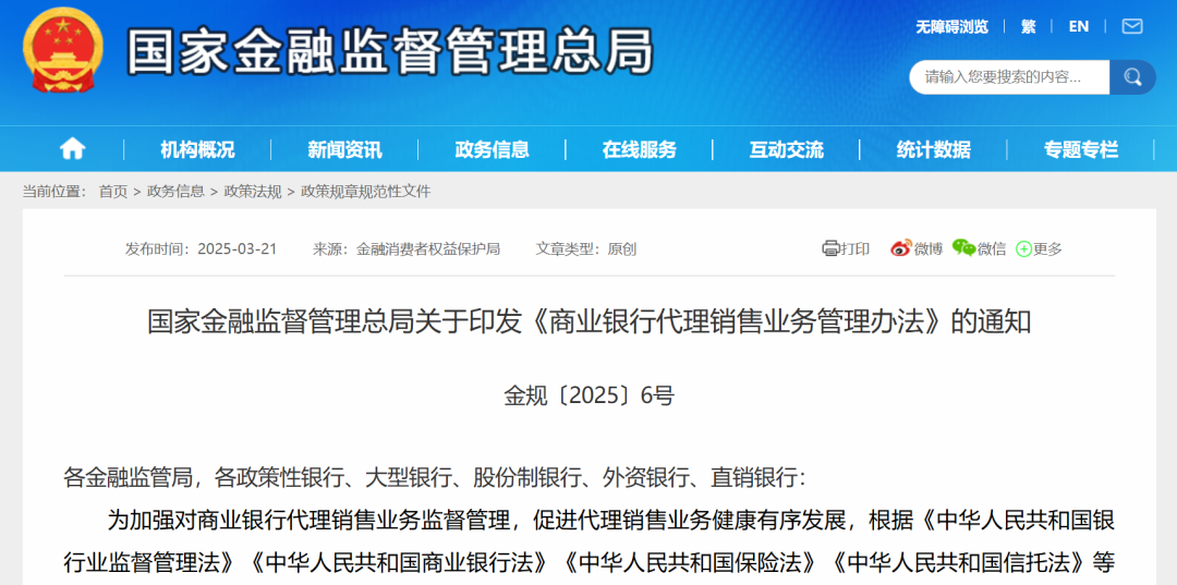 国家金融监督管理总局于2025年3月21日正式发布《商业银行代理销售业务管理办法》(以下简称《办法》),自2025年10月1日起施行。新规明确要求商业银行代销业务的合规管理,规范销售行为,并通过全流程风险防控机制保障金融消费者权益。