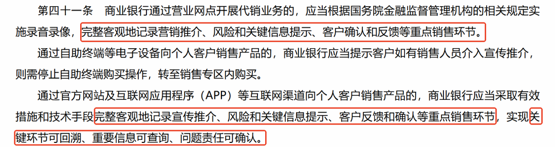 2024年2月,国家金融监督管理总局对 "三个办法一个指引" 进行修订,其中《个人贷款管理办法》明确要求,根据线上贷款、互联网贷款发展需要,视频面谈应当在贷款人自有平台上进行,记录并保存影像;规定面签 "双录" 和电子签约要求;《保险销售行为管理办法》将除订立保险合同这一狭义销售行为外的其他售前、售后行为均纳入销售行为监管范围,突出全流程保险销售可回溯行为监管。